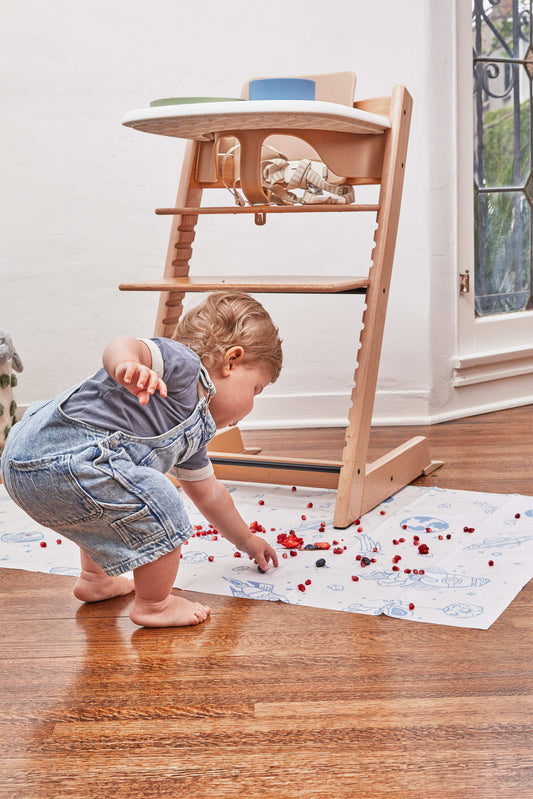 Mealtime just got easier. Our disposable splat mats slip under any high chair or helper tower to catch spills, crumbs, and everything in between—keeping your floors protected with zero clean-up.
